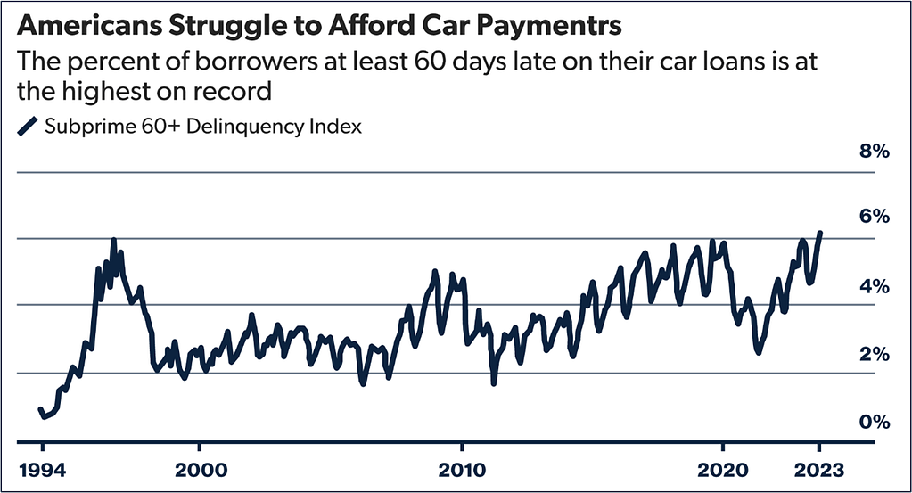 30-year mortgage rates are approaching 8%, the average credit card rate for consumers has surpassed 24%, and automobile loans are quickly approaching 10%. And oh, by the way, those that have outstanding student loans must actually make payments on them again. All those various pressures are creating strain on any family that is borrowing money.