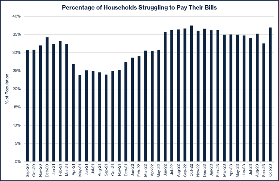 That is a significant spike from September, and one can easily hypothesize that it is at least partially caused by the resumption of student loan payments. For all the reasons mentioned above, consumers are feeling the pinch. The only good news is the job market remains resilient, so at least most of these families have a paycheck each month. If the employment environment starts to weaken, these consumers will find themselves between the proverbial rock and a hard place. And, of course, if the job market does not weaken, the Federal Reserve will continue to be stuck in the box we have discussed, where they have limited ability to come to the rescue out of fears that inflation will reaccelerate. This all leads to a conclusion that the stagflation we have talked about for several quarters is indeed real and likely here to stay. And, yes, that kind of economic environment has historically been a very challenging one for traditional stocks and bonds.