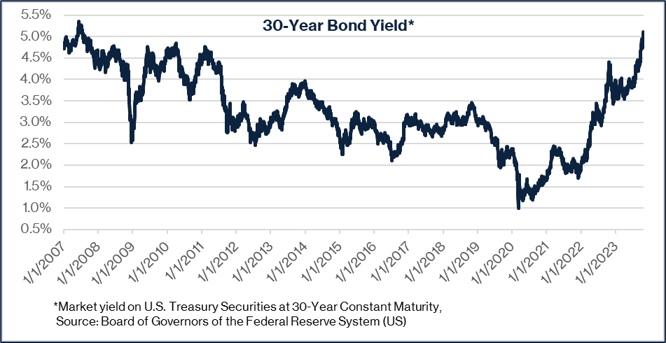 The item that probably got people’s attention the most in the 3rd quarter was the dramatic move experienced in longer dated interest rates. The Federal Reserve directly controls the level of short-term rates, but market participants are the main drivers of the behavior of long-term rates. Supply and demand matter, and while the Federal Reserve has intervened in long-term interest rates occasionally in the past like they did during Covid, the markets generally adjust interest levels to reflect inflation expectations and fiscal behavior.