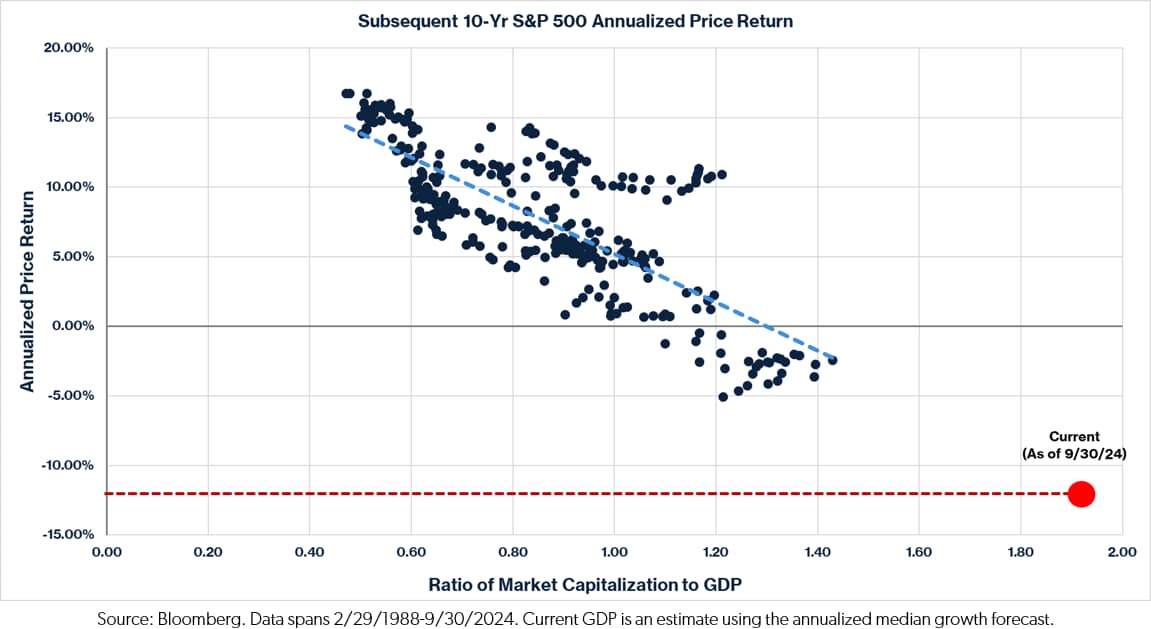 One of the tools that we use personally when making allocation decisions is the Buffett Indicator, made famous by the most famous investor, Warren Buffett. Not only has it been shockingly accurate, but it is also amazingly simple, in that it eliminates the noise and arguments about stock index constituent size, accuracy of analyst earnings estimates etc. It just looks at the ratio of market capitalization to Gross Domestic Product (“GDP”). Interpretation is also very straightforward in that you track the starting level of the indicator on a given date and how the S&P 500 has performed over the subsequent 10 years and place a point on the chart shown below. You then do that for each 10-year period and the trend becomes exceedingly easy to spot. When the market capitalization is low compared to GDP, stock market returns are good for the next 10 years. When that is not true, stock market returns are not as good. And, at extreme measures, there can be outsized gains and periods of very disappointing returns, even full decades with negative compounded performance.