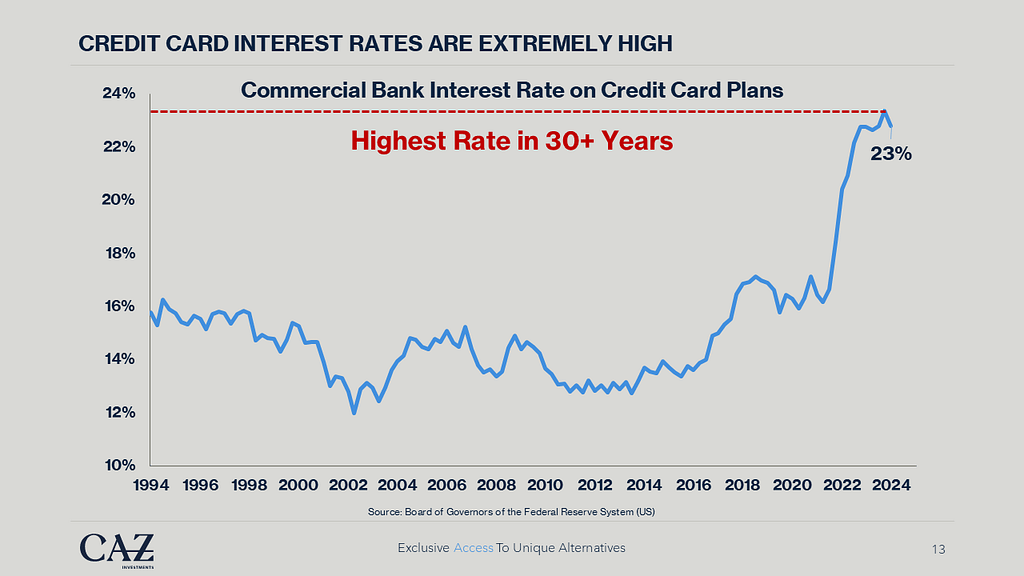 - Credit card interest rates are at a 30-year high, increasing financial strain on households.