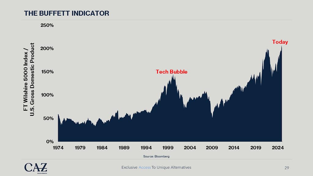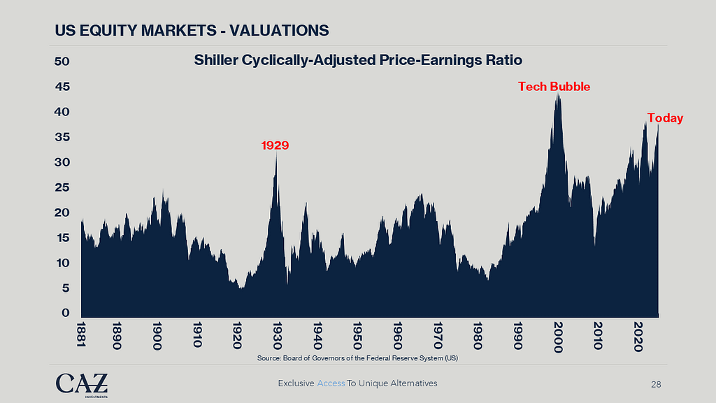 - The cyclically adjusted price-to-earnings ratio (CAPE) is at its highest level ever, other than the tech bubble of the late 90’s, even higher than before the Great Depression in 1929.