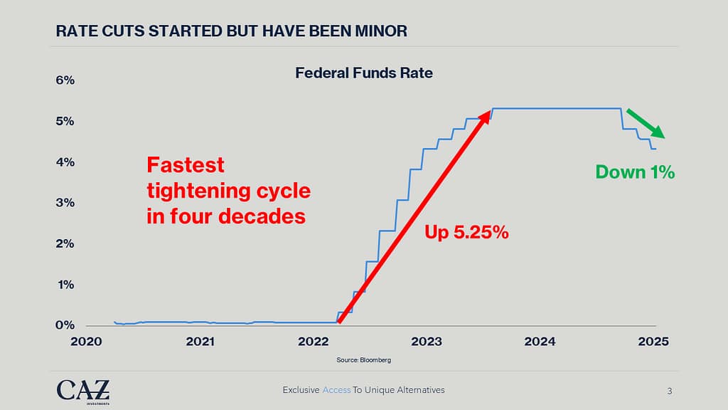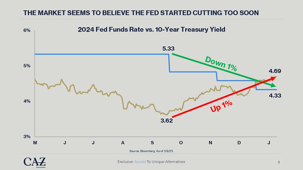 - The market appears to believe the Fed may have cut rates too soon, with long-term rates rising by 1%, offsetting much of the impact from the lowering of short-term rates.