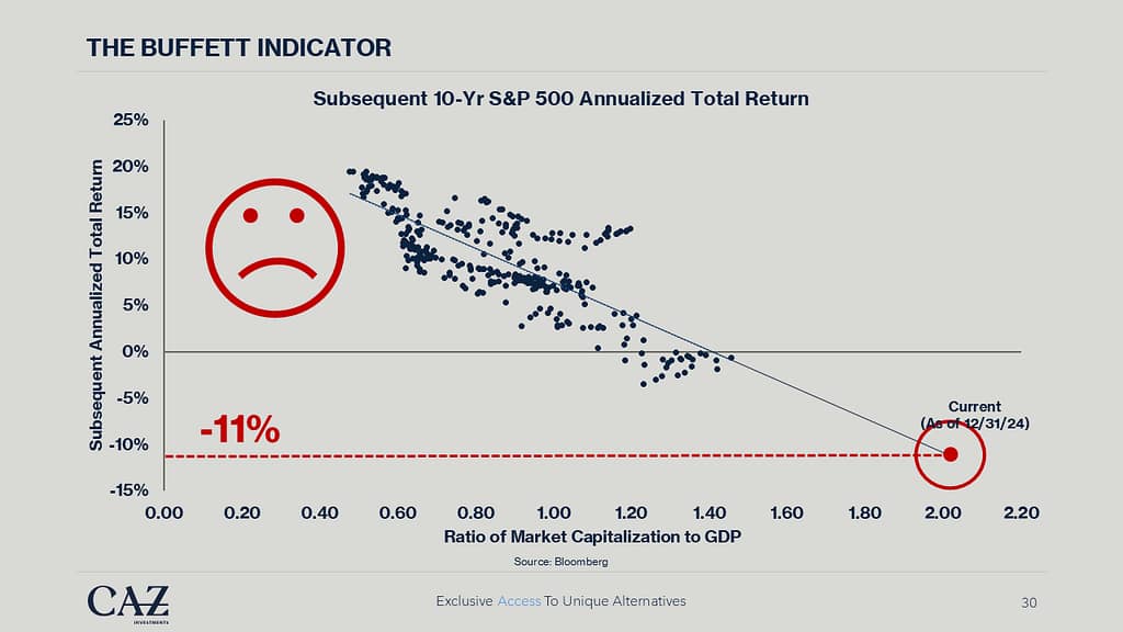 - The Buffett Indicator shows valuations significantly higher than even late 90’s tech bubble, and historical regression relationships would indicate the potential for -11% annualized returns over the next decade.