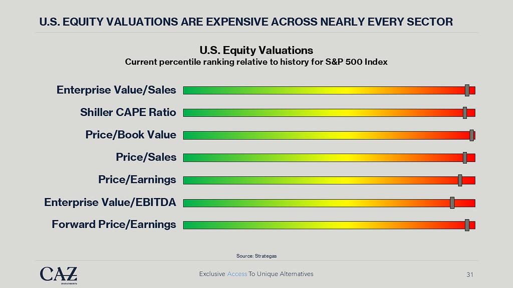 What will become clear to you from the information below is that there are very unique opportunities available, but there are also many risks to be concerned about, with the glaringly obvious one being valuations in traditional assets. The data should explain why we remain a “1” on the CAZ Scale. We firmly believe that the risk/reward profile of traditional risk assets is not very favorable. It is for this reason that we believe that every single investor must, not should, have a risk mitigation plan in place for their portfolio. We have created innovative solutions to help investors hedge their portfolio against the “what if,” and if you are not familiar with what we are doing in that area please speak to our Team to learn more.