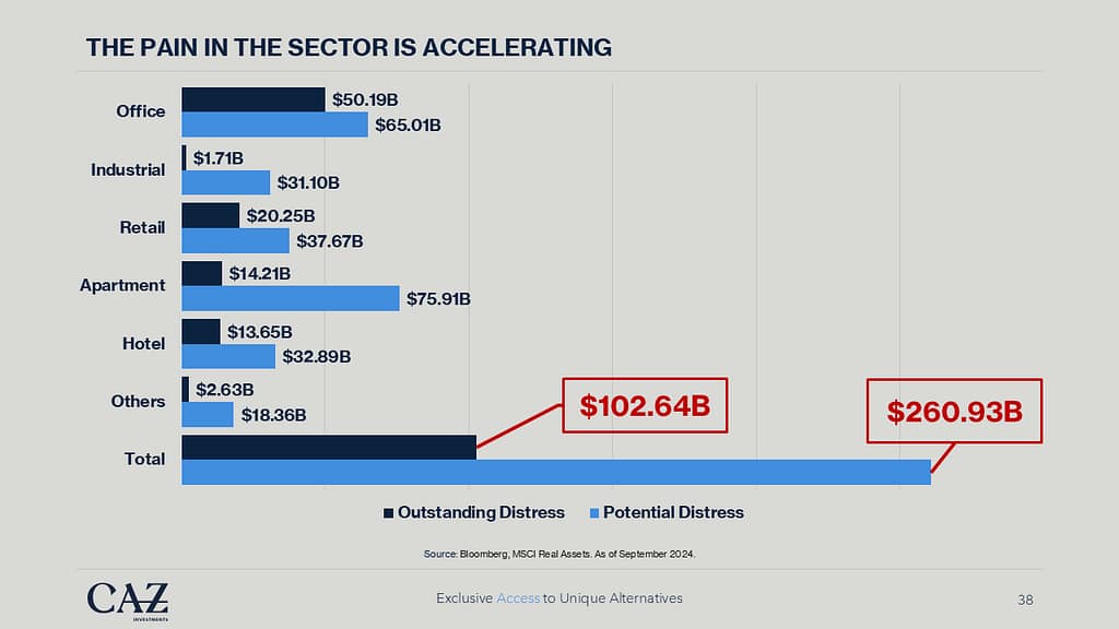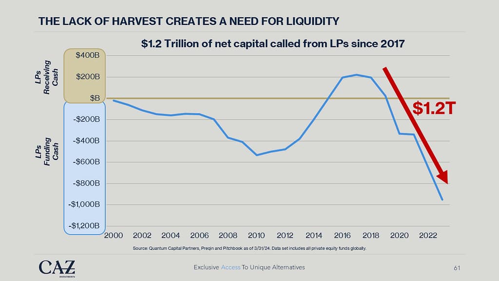 - Limited Partners of private equity funds have experienced $1.2T of net outflows in the last 7 years and face limited liquidity options, such as selling assets at a discount or seeking expensive loans.