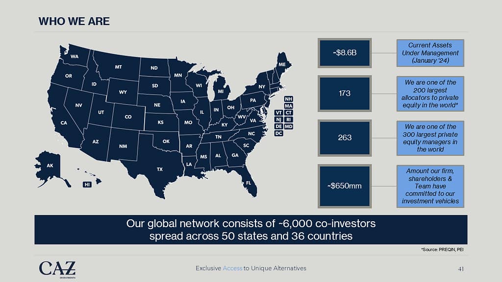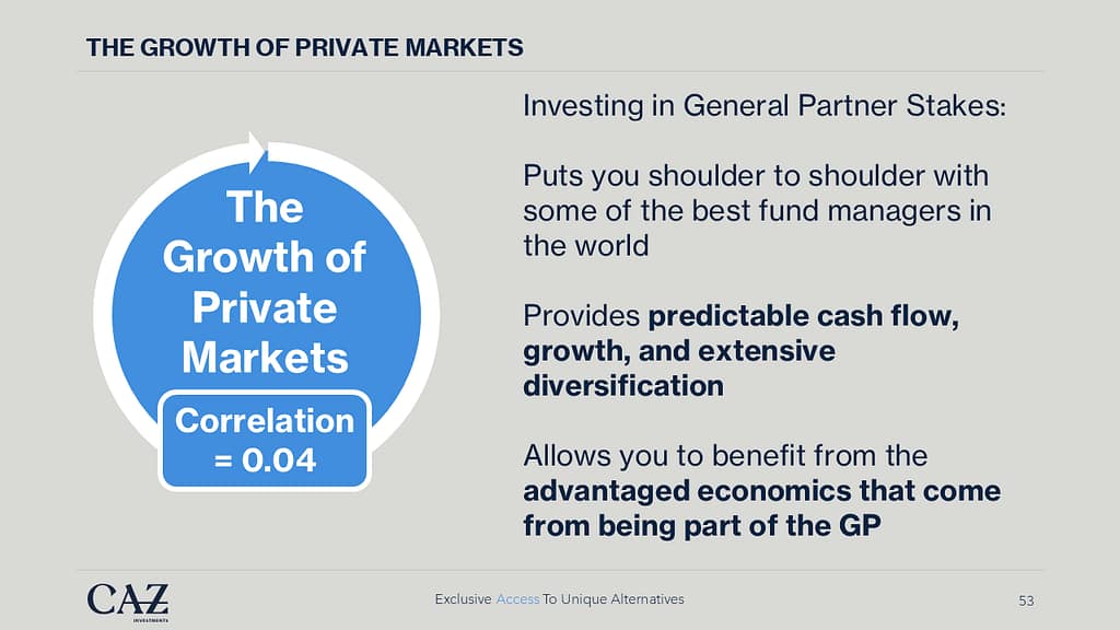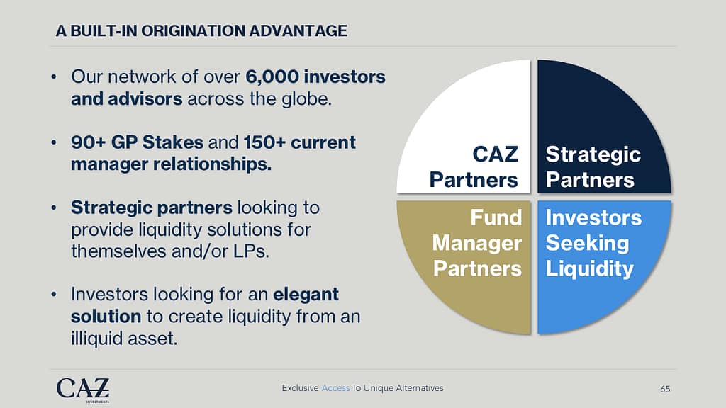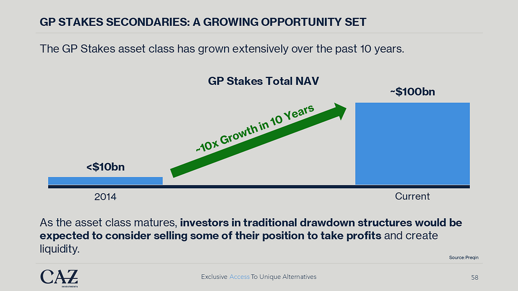 - Secondary market for GP stakes has grown 10x in the last decade and CAZ is the dominant player.