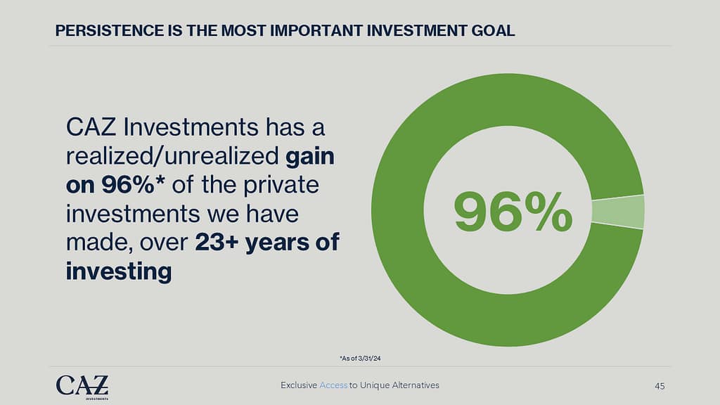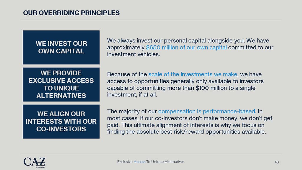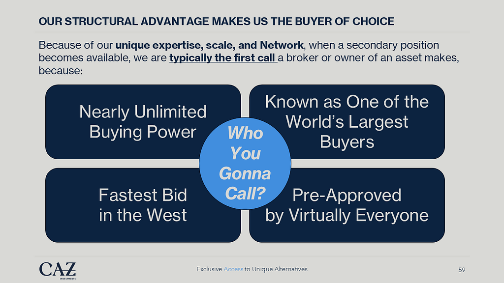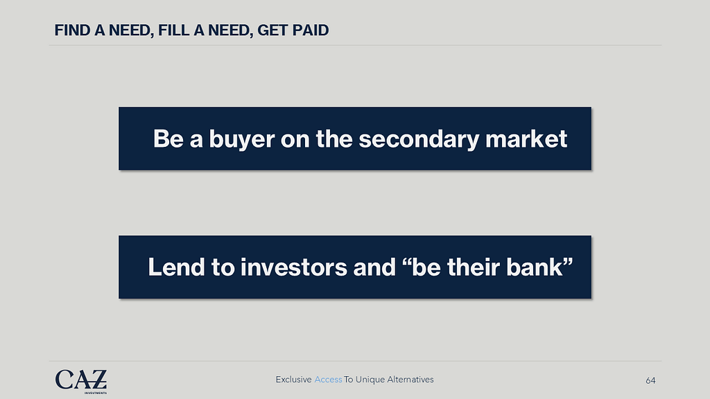 - CAZ has positioned itself to be a significant buyer of assets in the secondary market, frequently at very attractive discounts, and as the market leading lender to the owners of alternative investments.