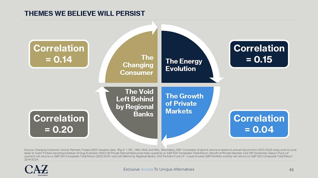 - Investments in energy, GP stakes, private credit, and sports have historically provided very good returns, with little correlation to each other or to other asset classes.