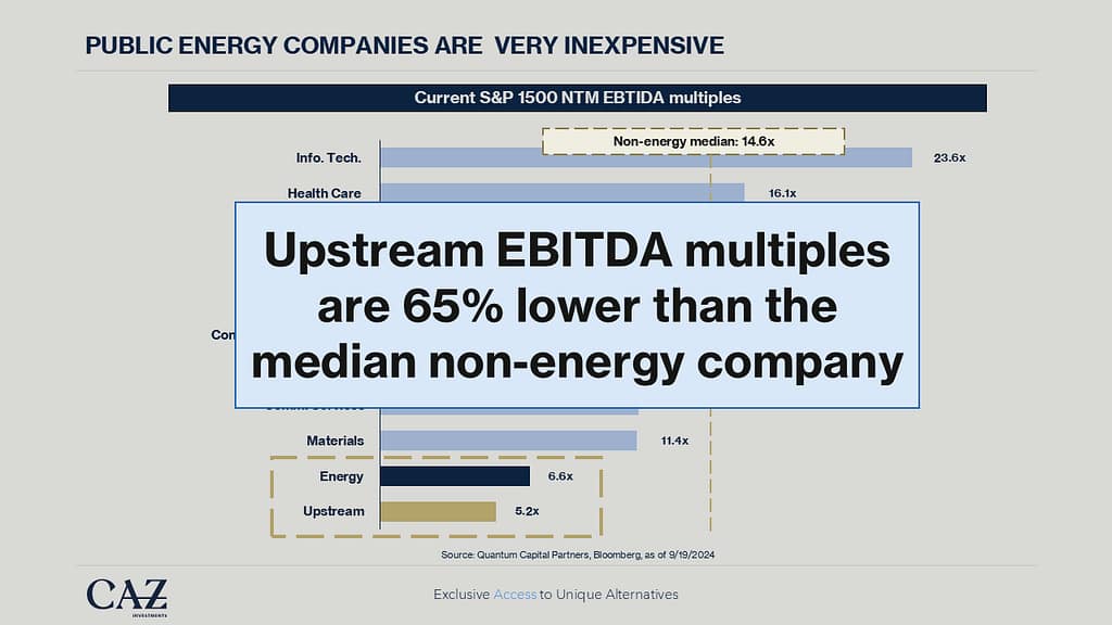 - Public energy companies trade at a 65% discount to non-energy sectors.