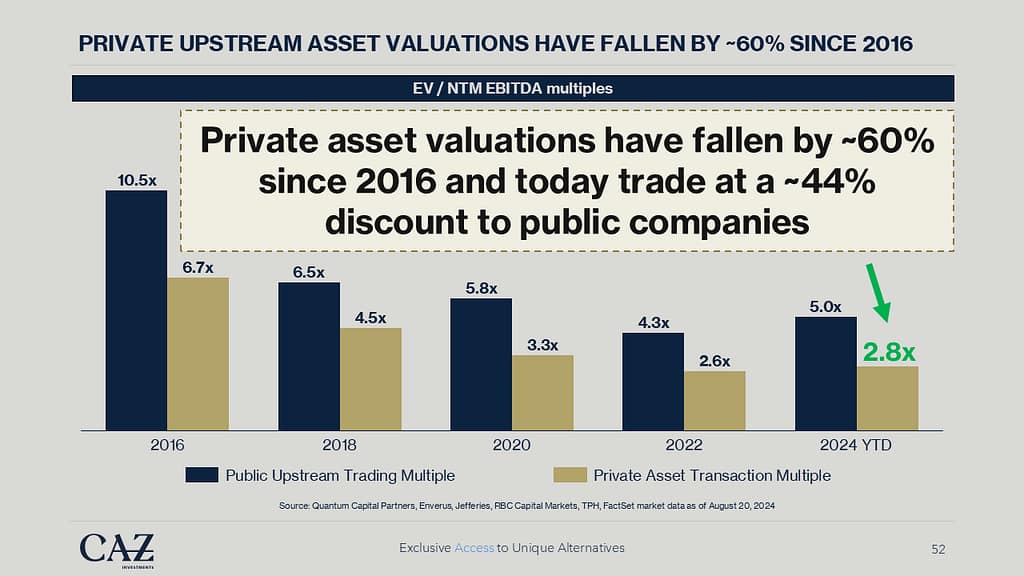 - Private upstream assets are undervalued by 44% compared to public counterparts.