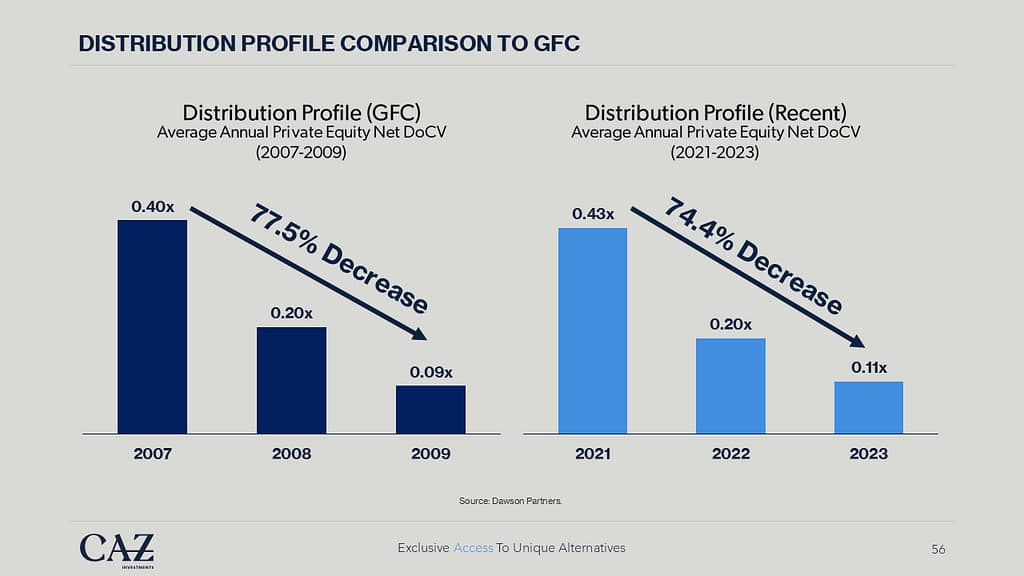- The lack of harvest across the world of private equity over the last 3 years bears a strong resemblance to the levels experienced in the Global Financial Crisis. If that relationship was maintained, the next few years could generate a significant increase in distribution levels. That could benefit the owners of the firms that are managing the capital, in the form of significantly increased revenue from Carried Interest.