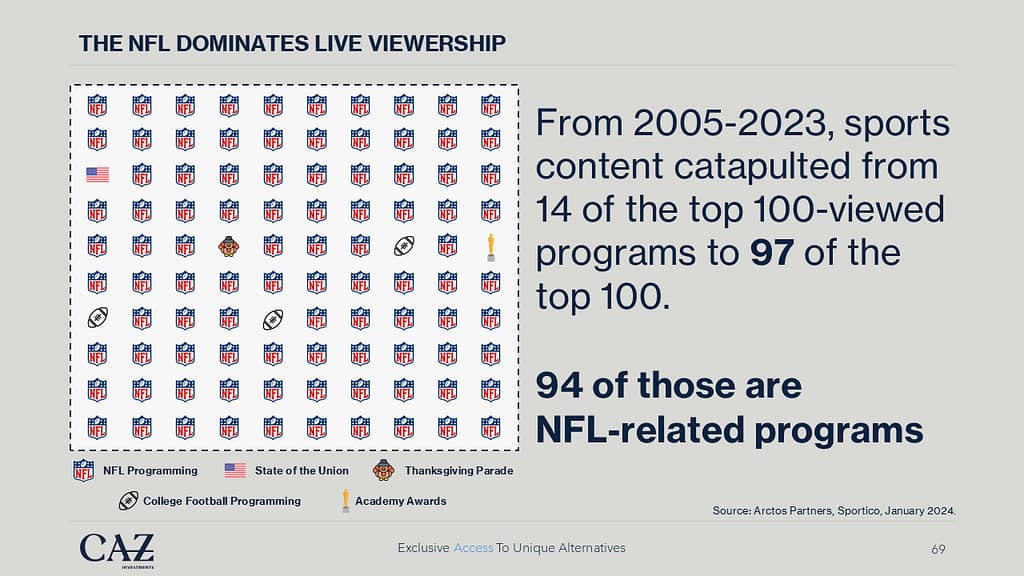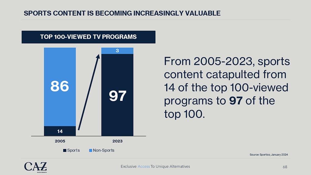 - Sports accounted for 97 of the top 100 most-watched live programs in 2023, up from 14 in 2005.